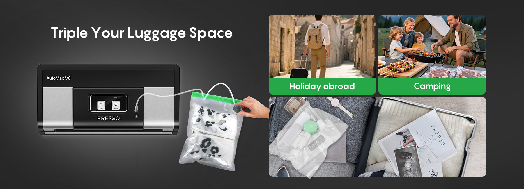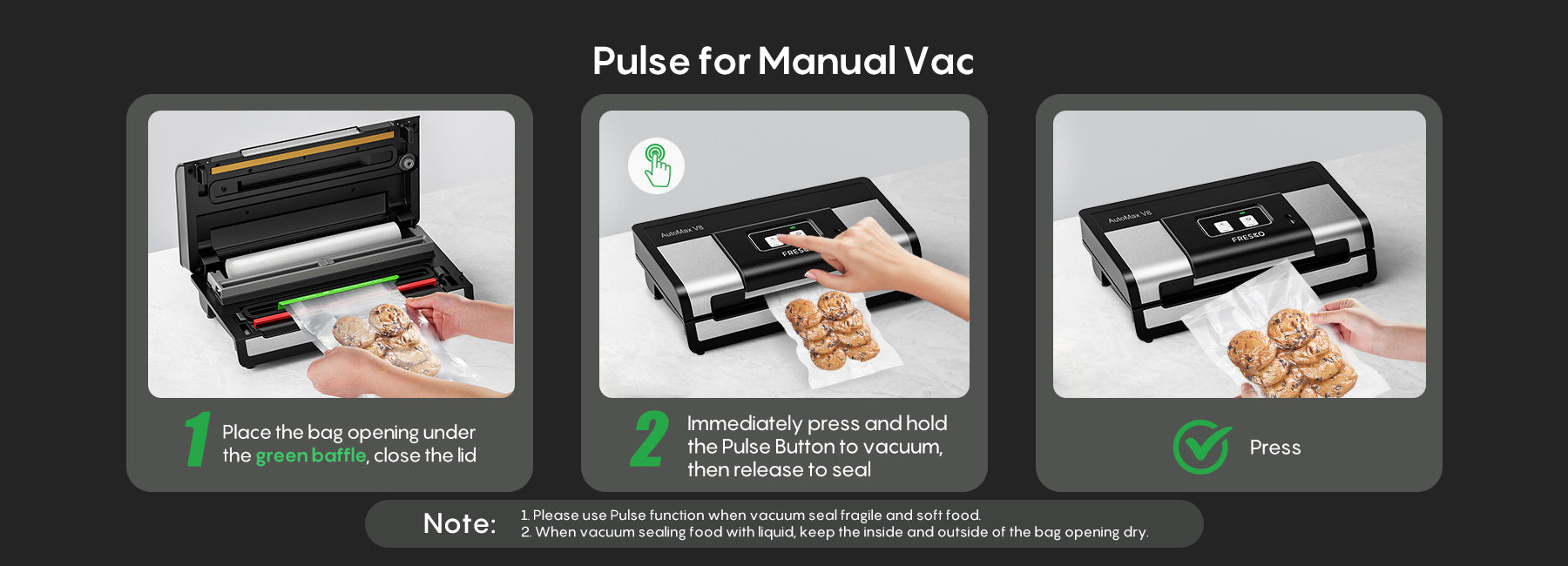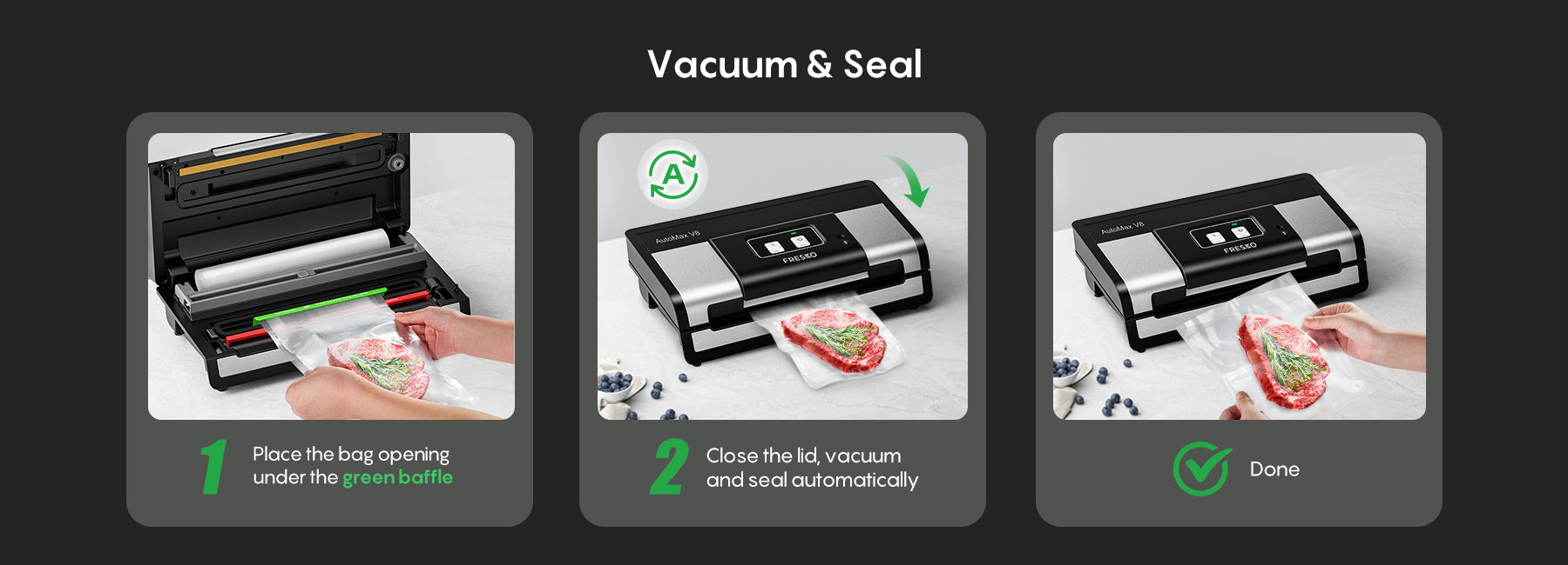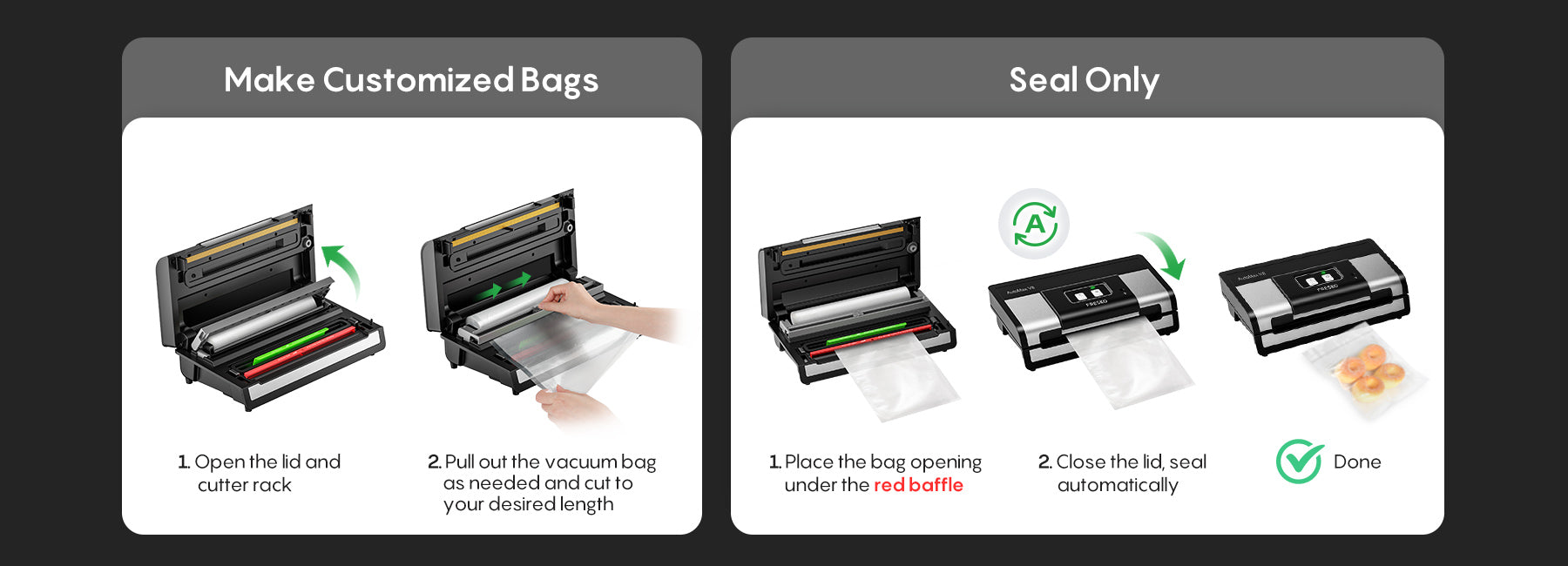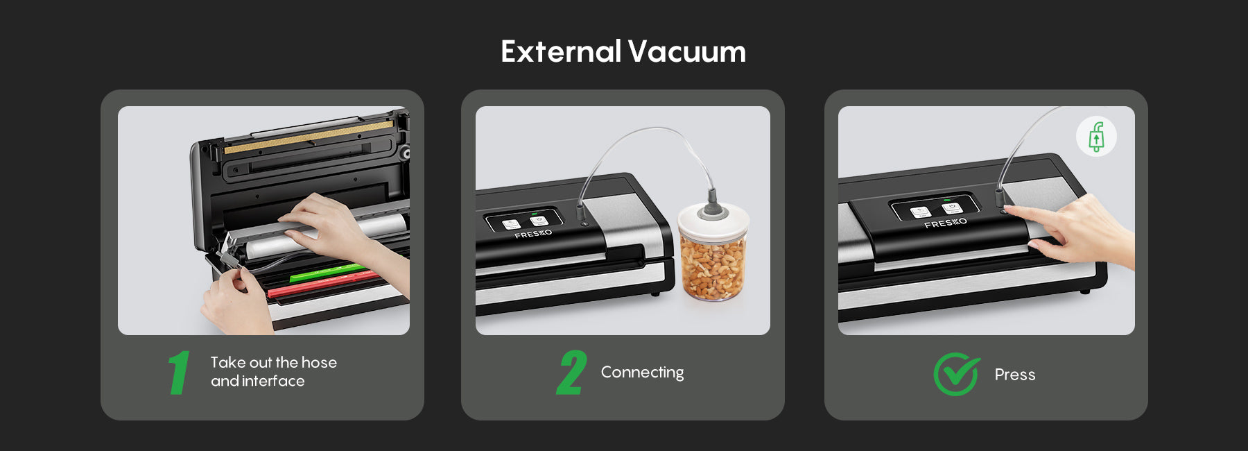 This sealer's integrated, all-in-one structure combines roll storage and a slide cutter, making it effortless to create custom-sized bags. This convenient design streamlines your workflow, while the external vacuum port expands its versatility, allowing you to easily preserve food in canisters, containers, and wine bottles.