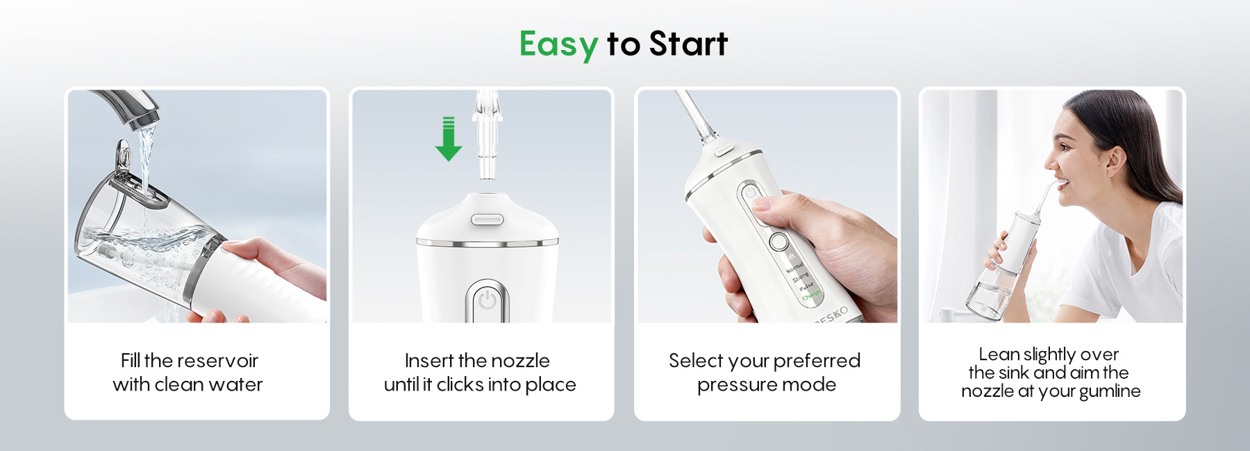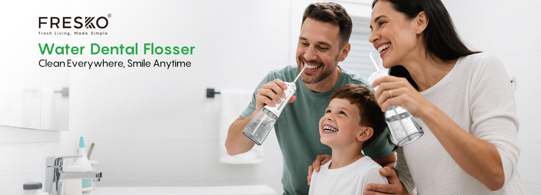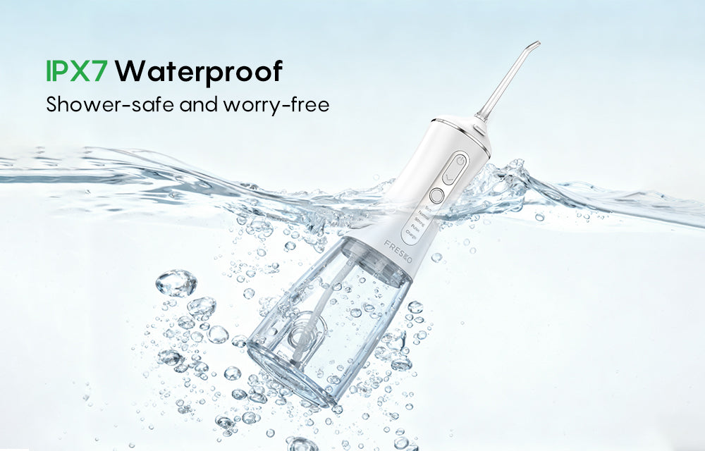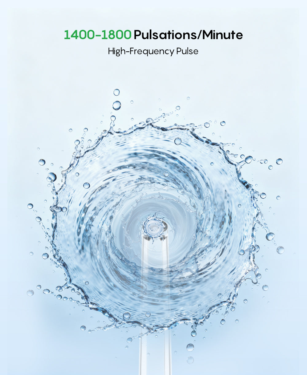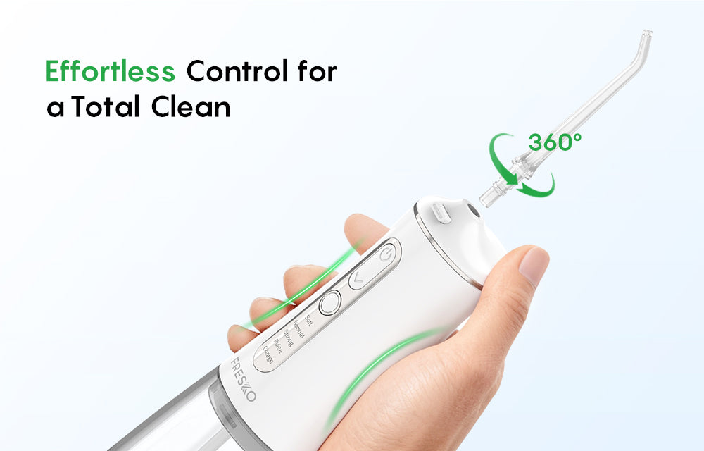 Unleash your mouth's full cleaning potential with the FRESKO Water Flosser. It combines a high-frequency pulse of up to 1400-1800 pulsations per minute with a 360° rotating precision nozzle to powerfully and gently remove stubborn plaque and food debris from between teeth and below the gumline.