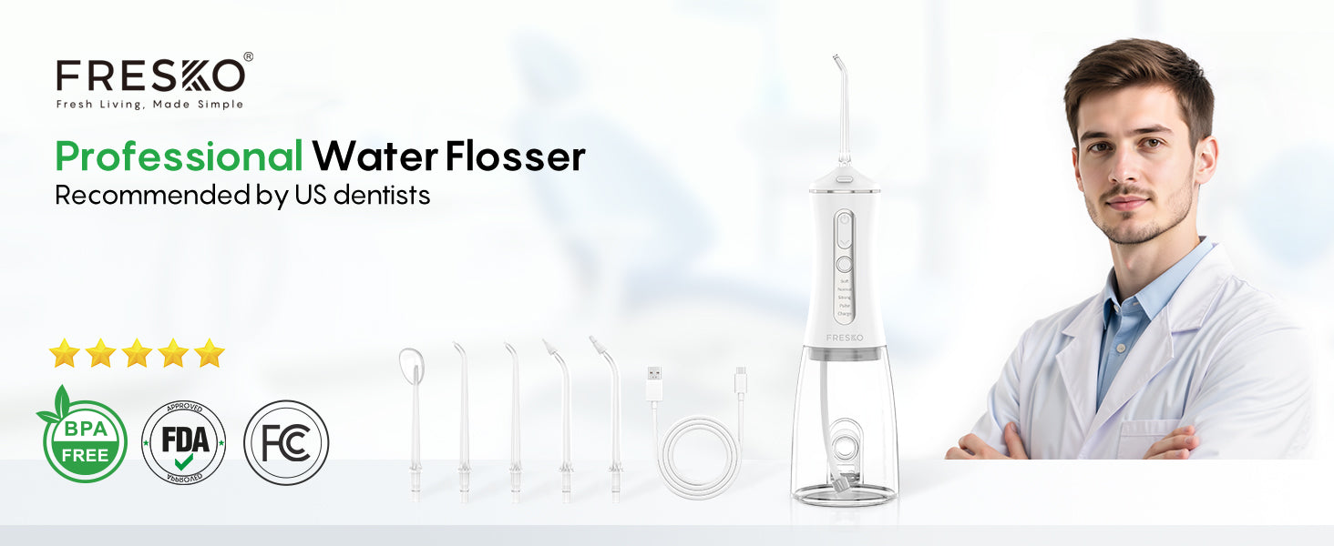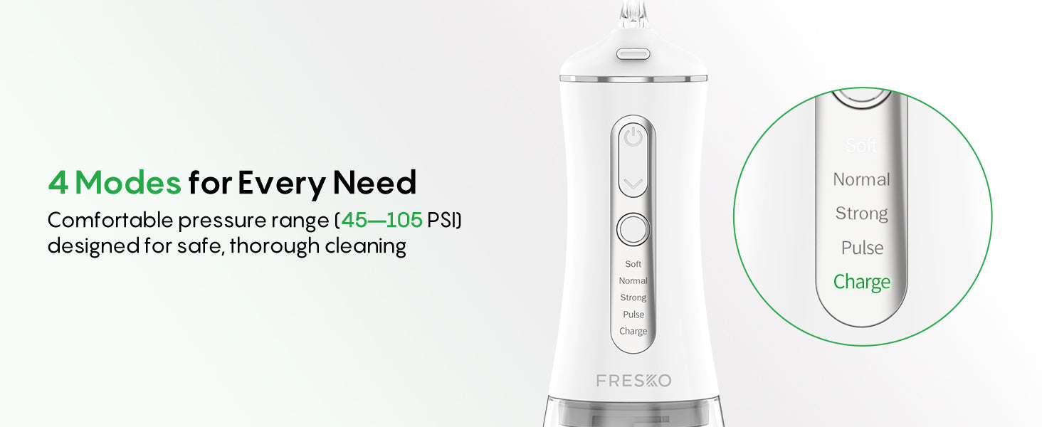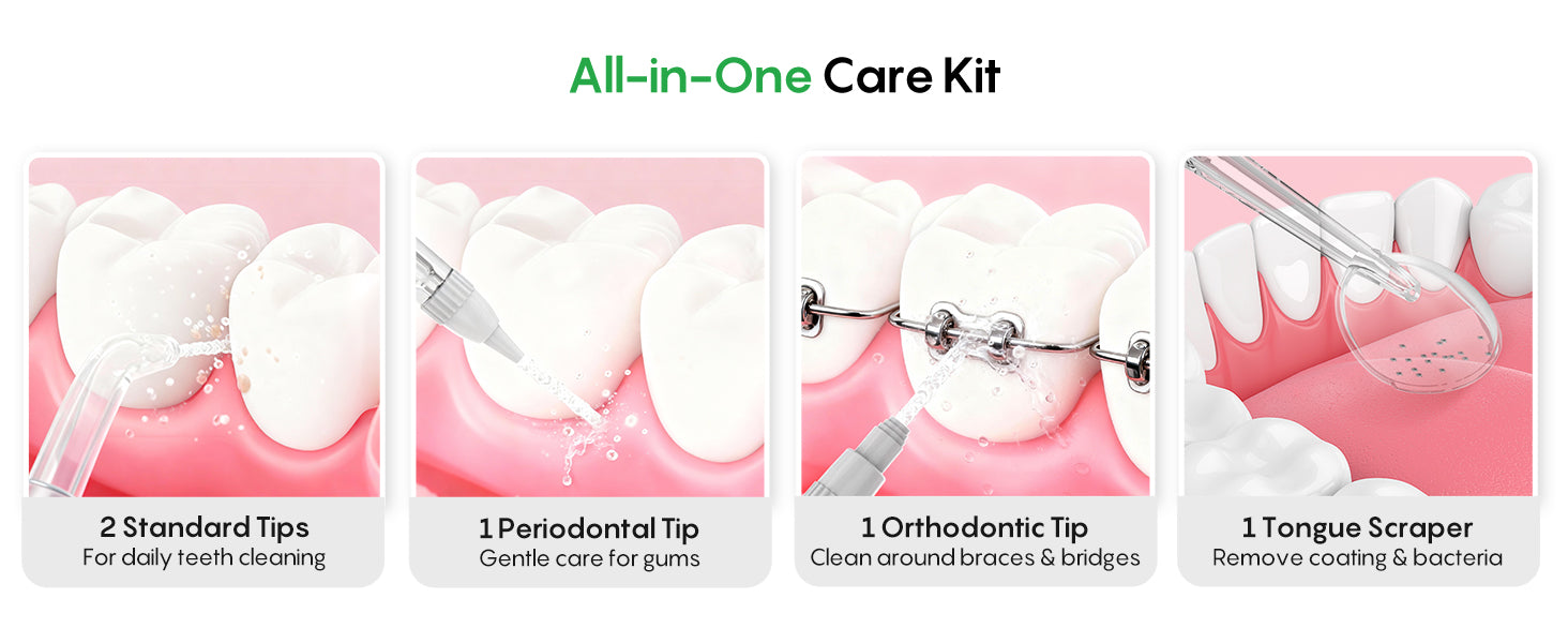 - 4 Modes & Comprehensive 5-Tip Kit: Customize your flossing with Soft, Normal, Strong, and Pulse modes for any sensitivity level. Kit includes 5 professional tips: 2 Standard, 1 Periodontal (for pockets), 1 Orthodontic (for braces), and 1 Tongue Scraper, meeting the diverse needs of the entire family.